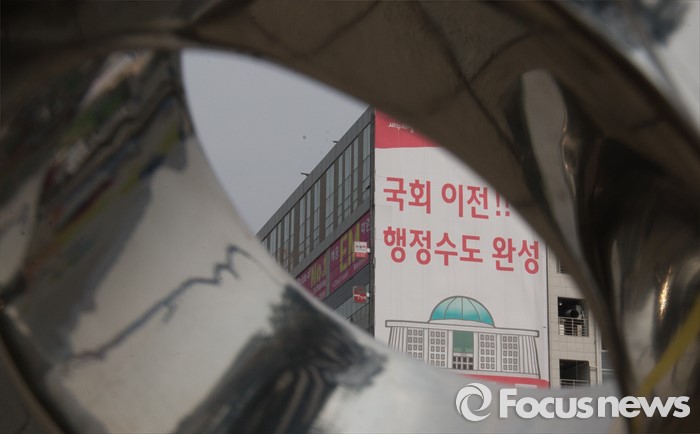 (세종=포커스뉴스) 29일 오전 세종시 국회의원 후보 선거사무소 외벽에 '국회이전, 행정수도 완성'이라는 공약이 적힌 현수막이 걸려있다.