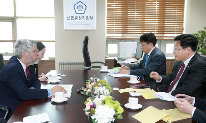 (서울=포커스뉴스) 주형환 산업통상자원부 장관은 29일 오후 서울 종로구 정부서울청사 외교부 집무실에서 ‘한미 과학기술협력 공동위원회’에 참석하기 위해 방한중인 존 홀드렌 (John P. Holdren) 미국 백악관 과학기술정책실장(장관급)의 예방을 받고, 한.미 양국간 기후변화대응, 에너지신산업 등 에너지정책에 대해 의견을 교환하고 있다. <사진제공=산업통상자원부>