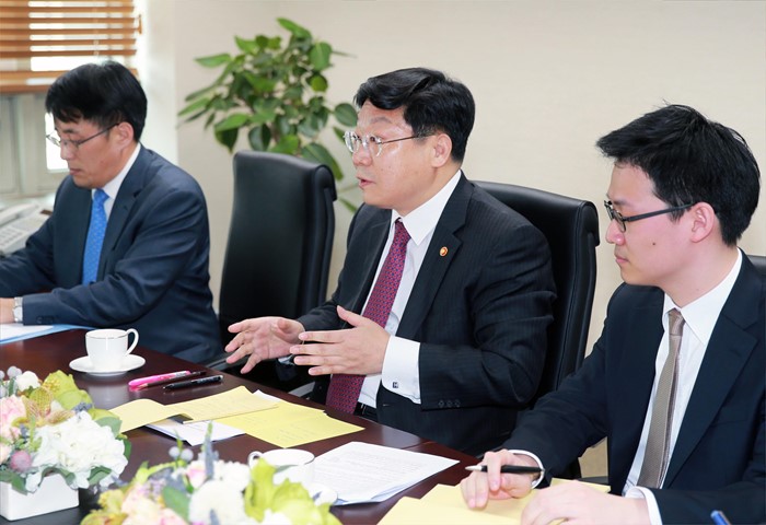(서울=포커스뉴스) 주형환 산업통상자원부 장관은 29일 오후 서울 종로구 정부서울청사 외교부 집무실에서 ‘한미 과학기술협력 공동위원회’에 참석하기 위해 방한중인 존 홀드렌 (John P. Holdren) 미국 백악관 과학기술정책실장(장관급)의 예방을 받고, 한.미 양국간 기후변화대응, 에너지신산업 등 에너지정책에 대해 의견을 교환하고 있다. <사진제공=산업통상자원부>
