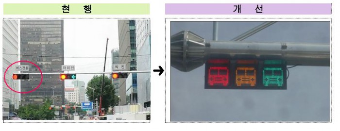 '버스삼색등'은 빛을 내는 LED소자를 버스모양으로 제작한 것으로 일반신호등과 시각적으로 구분된다.