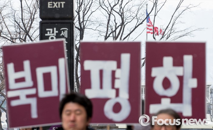 또 “피고인들은 코리아연대의 핵심 조직원들로서 이적단체의 활동에 앞장섰고 범행을 뉘우치지도 않고 있다”며 “적화통일 노선을 고수하면서 현실적으로 (민주주의를) 위협하는 세력을 엄중히 처단할 필요가 있다”고 양형의 이유를 설명했다.(서울=포커스뉴스) 코리아연대 회원들이 '북미평화협정 체결과 키리졸브훈련 반대' 구호를 외치고 있다. 2016.02.29 양지웅 기자