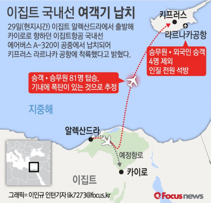 (서울=포커스뉴스) 29일(현지시간) 이집트 알렉산드라에서 출발해 카이로로 향하던 이집트항공 국내선 에어버스 A-320이 공중에서 납치되어 키프러스 라르나카 공항에 착륙했다고 밝혔다.