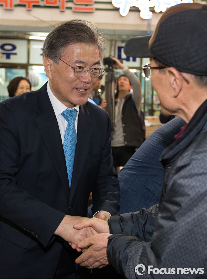 (논산=포커스뉴스) 문재인 더불어민주당 전 대표가 29일 오후 충남 논산시 중앙시장을 방문해 시민들과 악수하며 김종민 후보의 지지를 호소하고 있다.