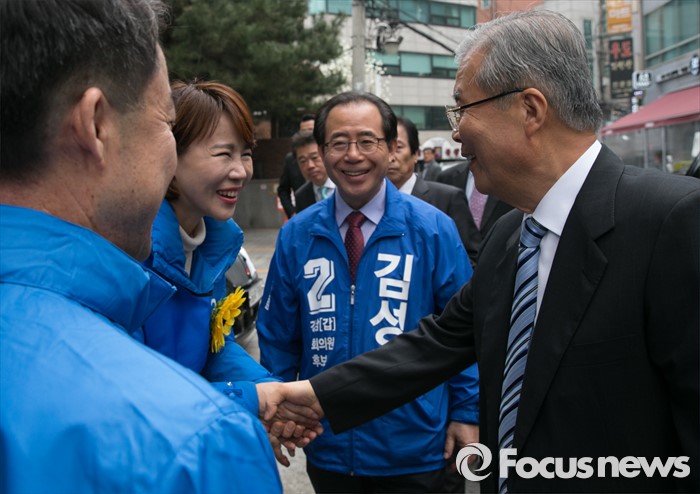 (서울=포커스뉴스) 김종인 더불어민주당 비대위 대표가 29일 오후 서울 강남구 전국개인택시회관에서 열린 전국개인택시연합회 정책간담회에 참석해 서울 강남구 후보들과 인사하고 있다. 왼쪽부터 전원근 강남병, 전현희 강남을, 김성곤 강남갑 후보, 김 대표.