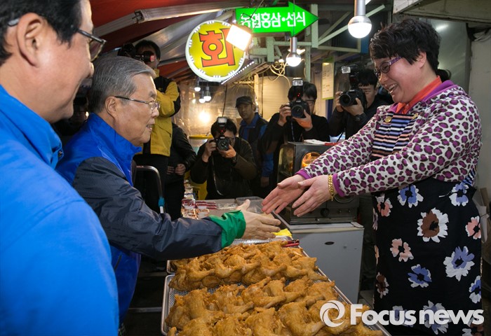 (서울=포커스뉴스) 김종인 더불어민주당 비대위 대표가 29일 오후 서울 송파구 새마을시장을 방문해 상인들과 인사하며 지지를 호소하고 있다.