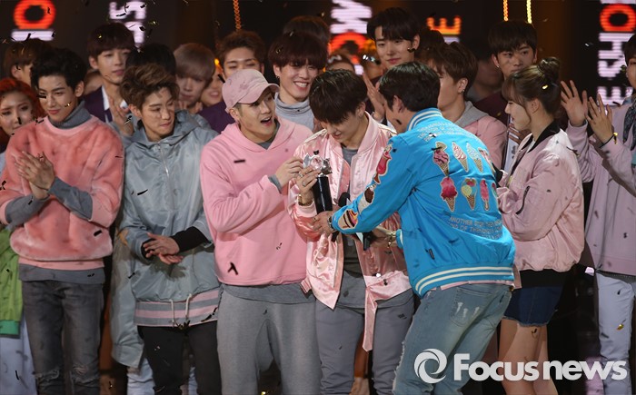 (서울=포커스뉴스) 29일 오후 서울 마포구 SBS프리즘 타워에서 열린 2016 '더쇼' 생방송에 참여한 아이돌 그룹 GOT7 더쇼 초이스에 선정된 후 놀란 표정을 짓고 있다.