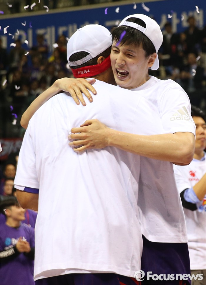 (고양=포커스뉴스) 29일 고양체육관에서 열린 2015-2016 프로농구 챔피언결정전에서 KCC를 4승2패로 물리치고 우승을 차지한 오리온의 최진수와 문태종이 얼싸 안으며 기뻐하고 있다.