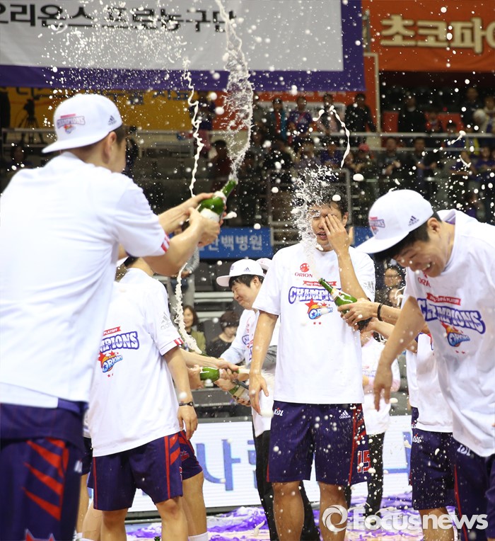 (고양=포커스뉴스) 29일 고양체육관에서 열린 2015-2016 프로농구 챔피언결정전에서 KCC를 4승2패로 물리치고 우승을 차지한 오리온 선수들이 샴페인을 뿌리며 환호하고 있다.