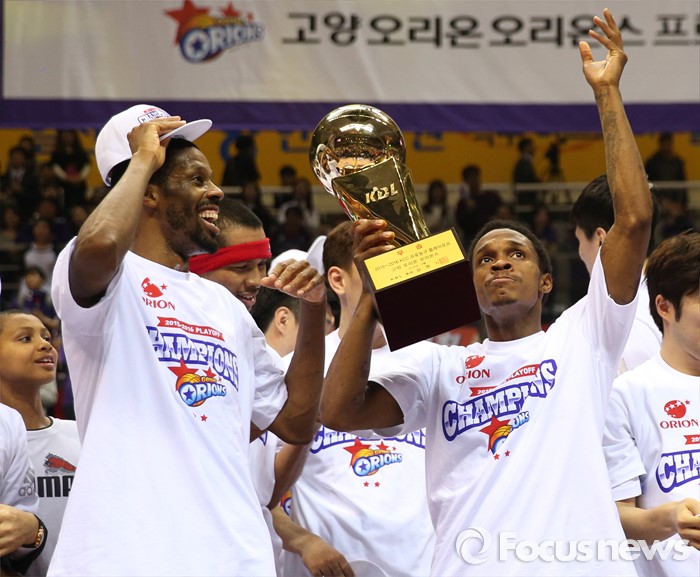 (고양=포커스뉴스) 29일 고양체육관에서 열린 2015-2016 프로농구 챔피언결정전에서 KCC를 4승2패로 물리치고 우승을 차지한 오리온 헤인즈와 조 잭슨이 우승 트로피를 들고 기뻐하고 있다.