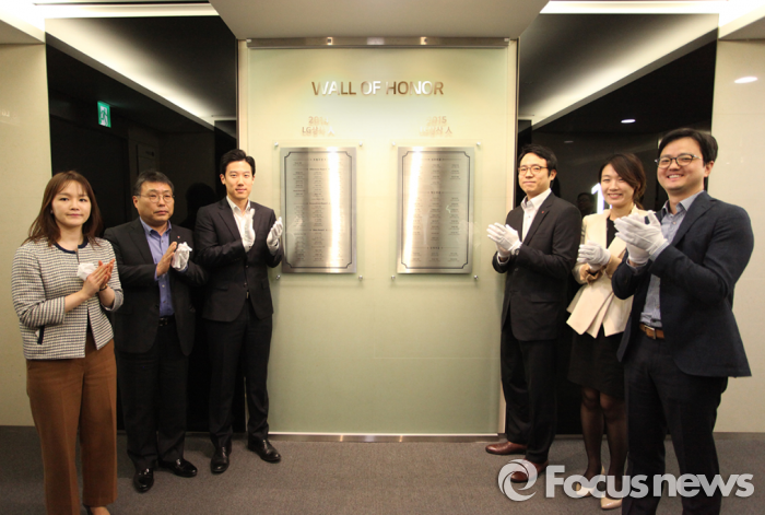 (서울=포커스뉴스) LG상사는 지난 29일 우수한 성과를 낸 임직원들의 이름을 새긴 '명예의 벽(Wall of Honor)'을 LG트윈타워 본사에 설치하고 제막식을 가졌다고 30일 밝혔다.