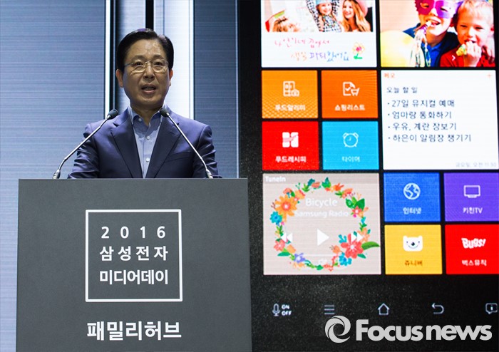 (서울=포커스뉴스) 서병삼 삼성전자 생활가전사업부 부사장이 30일 오전 서울 강남구 삼성전자 서초사옥에서 열린 '2016 삼성전자 패밀리 허브' 미디어데이에 참석해 제품소개를 하고 있다.