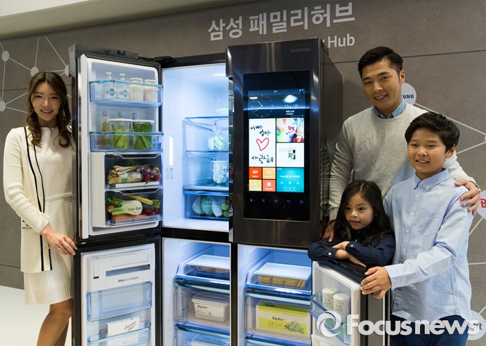 (서울=포커스뉴스) 30일 오전 서울 강남구 삼성전자 서초사옥에서 모델들이 '2016 삼성전자 패밀리 허브' 냉장고를 선보이고 있다.