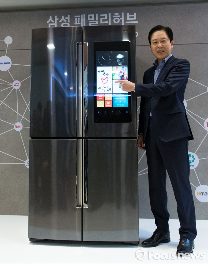 (서울=포커스뉴스) 서병삼 삼성전자 생활가전사업부 부사장이 30일 오전 서울 강남구 삼성전자 서초사옥에서 열린 '2016 삼성전자 패밀리 허브' 미디어데이에서 제품을 선보이고 있다.