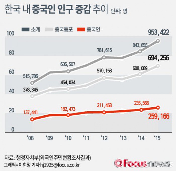 재한동포총연합회 관계자는 "한국에서 잘 적응하지 못하고 있는 중국동포들이 많은 상황"이라며 "선거권도 중요하지만 한국 정치를 기본적으로 익힐 수 있는 시스템이 필요하다"고 밝혔다.30일 오후 서울 영등포구 대림2동에서 구직자들이 구인공고를 살펴보고 있다. 박나영 기자 2015년 기준 한국 내 중국계 한국인(중국동포·조선족)과 중국인 인구 증감 추이. <자료제공=행정자치부>30일 오후 서울 영등포구 대림2동에서 구직자들이 구인공고를 살펴보고 있다. 박나영 기자