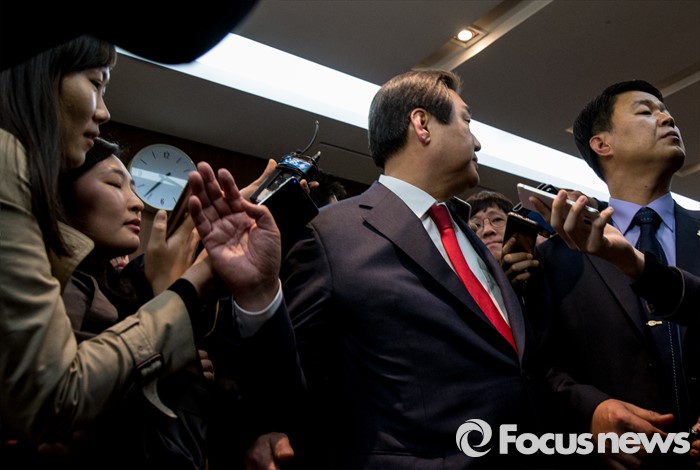 (서울=포커스뉴스) 30일 오후 서울 중구 프레스센터에서 열린 관훈클럽 초청 관훈토론회를 마친 김무성 새누리당 대표가 엘리버이터로 발걸음을 옮기며 취재진의 질문을 거절하고 있다.
