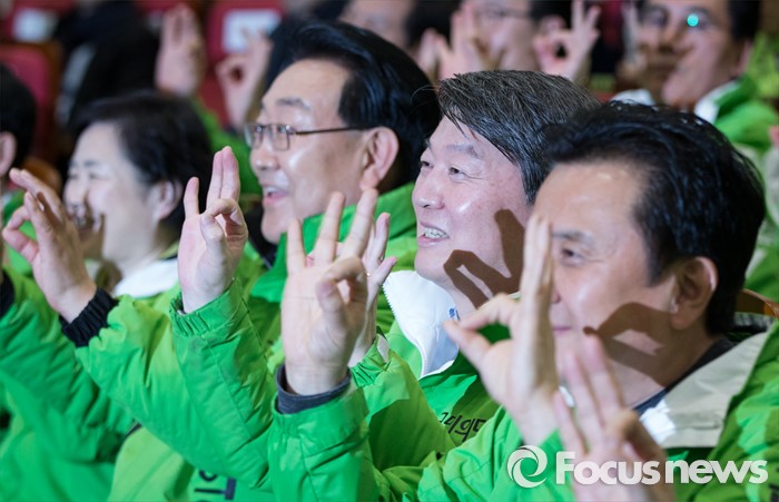 (서울=포커스뉴스) 안철수 국민의당 상임공동대표와 최고위원들이 30일 오후 서울 여의도 국회에서 열린 총선 승리를 위한 국민의당 수도권 후보 출정식에서 손가락으로 3번을 만들어 보이고 있다.