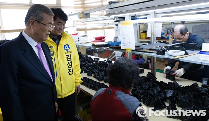 (인천=포커스뉴스) 김종인(왼쪽) 더불어민주당 비대위 대표와 김성진 정의당 인천 남구을 야권 단일후보가 30일 오후 인천 남구 노인인력센터를 방문해 어르신들과 인사 후 작업장을 둘러보고 있다.