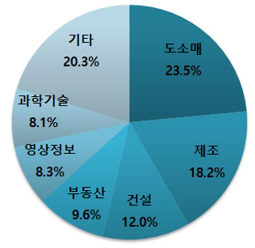 업종별로는 도소매업 1620개(23.5%), 제조업 1255개(18.2%), 건설업 829개(12.0%), 부동산임대업 660개(9.6%) 순으로 새롭게 생겼다. 증가율 측면에선 도소매업(271개)과 출판영상정보서비스업(138개) 등이 지난해 같은 기간과 비교해 가장 높았다.