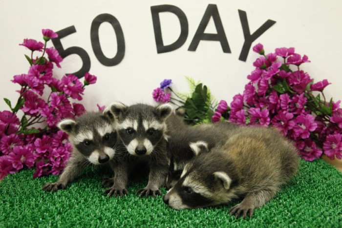 지난 2월7일 태어난 라쿤 4쌍둥이는 지난 27일로 탄생 50일을 맞았다. 70g으로 세상에 태어난 라쿤의 몸무게는 현재 960g으로 늘었고, 걸음마를 시작하는 등 빠른 성장을 보이고 있다.지난 2월7일 태어난 라쿤 4쌍둥이가 탄생 50일을 맞았다.<사진제공=한화리조트>