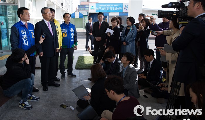 (서울=포커스뉴스) 김종인 더불어민주당 비대위 대표가 30일 오후 인천 남구 노인인력센터를 방문 후 취재진 질문에 답하고 있다. 왼쪽부터 허종식 인천 남구갑 후보, 김 대표, 김성진 정의당 인천 남구을 야권 단일후보, 홍영표 더민주 인천 부평을 후보.
