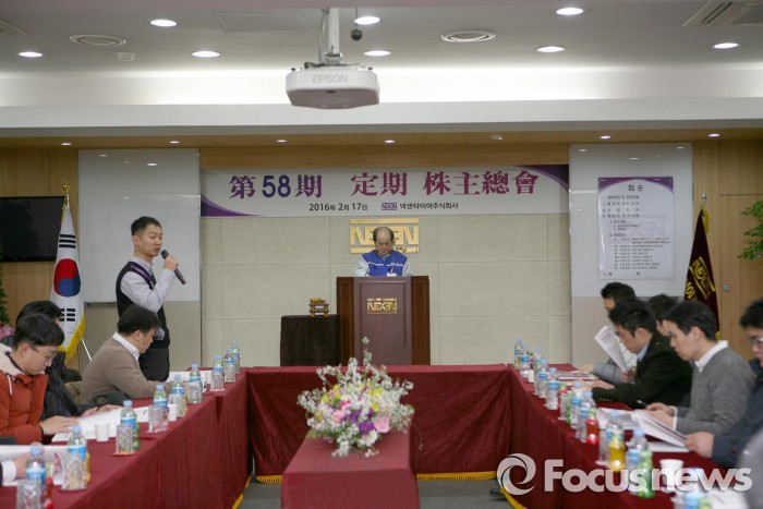 이 대표는 급여로 5억1400만원, 상여금으로 1억9900만원을 받았다.17일 양산 넥센타이어 본사 강당에서 이현봉 넥센타이어 대표이사(가운데)가 주주총회를 주재하고 있다. <사진제공=넥센타이어>