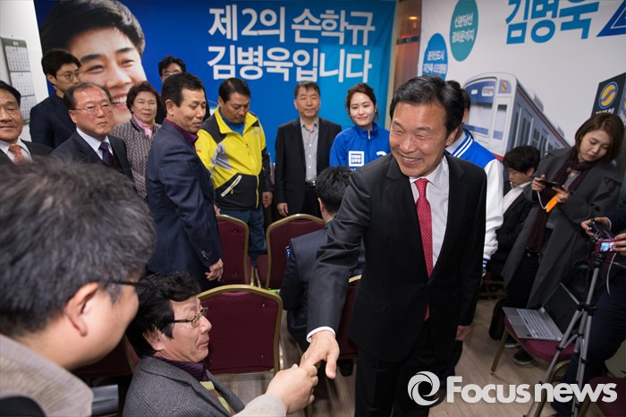 (성남=포커스뉴스) 손학규 전 더불어민주당 상임고문이 30일 오후 경기도 성남시 김병욱 더민주당 분당을 후보 선거사무소을 방문해 지지자들과 악수하고 있다.