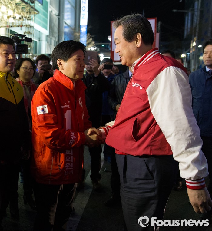 (서울=포커스뉴스) 4.13총선 공식선거운동 첫날인 31일 오전 서울 중구 동대문 누죤 앞에서 김무성 새누리당 공동선대위원장이 지상욱 서울 중구성동구을 후보와 악수를 하고 있다.