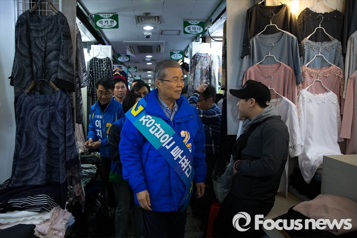 (서울=포커스뉴스) 김종인 더불어민주당 대표가 4.13총선 공식선거운동 첫날인 31일 오전 서울 중구 동대문에 위치한 한 쇼핑몰에서 상인들을 상대로 선거운동을 하고 있다.