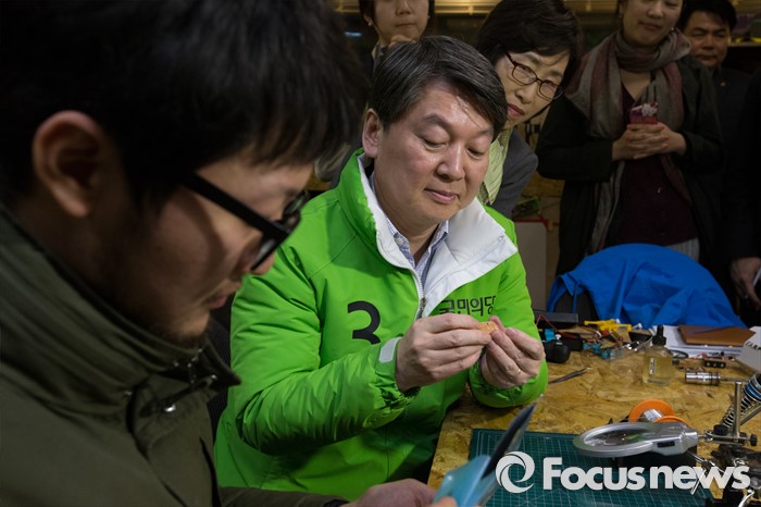 (서울=포커스뉴스) 4.13총선 공식선거운동 첫날인 31일 오전 서울 종로구 세운전자상가 '팹랩 서울(FABLAB SEOUL)'에서 안철수 국민의당 상임공동대표가 미래 일자리 청년 아카데미를 방문해 납땜을 체험하고 있다.