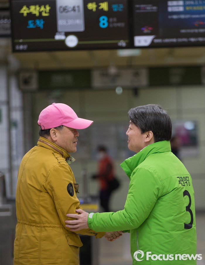 (서울=포커스뉴스) 총선 선거운동이 공식적으로 시작된 31일 오전 안철수 국민의당 노원병 후보가 서울 노원구 수락산역 역사 내에서 지역 주민들에게 출근 인사를 하고 있다.
