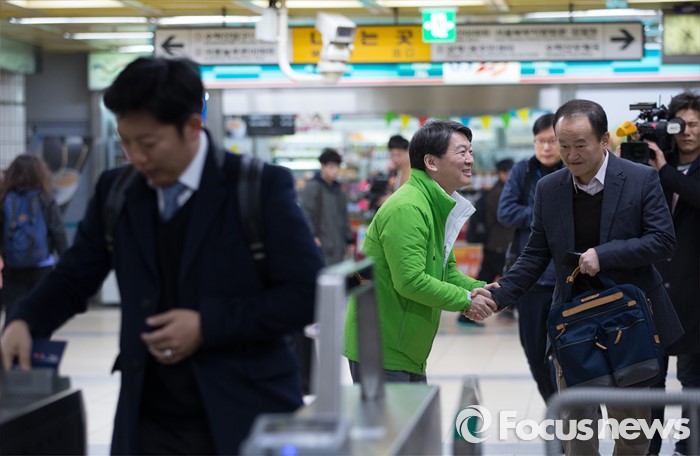 (서울=포커스뉴스) 총선 선거운동이 공식적으로 시작된 31일 오전 안철수 국민의당 노원병 후보가 서울 노원구 수락산역 역사 내에서 지역 주민들에게 출근 인사를 하고 있다.