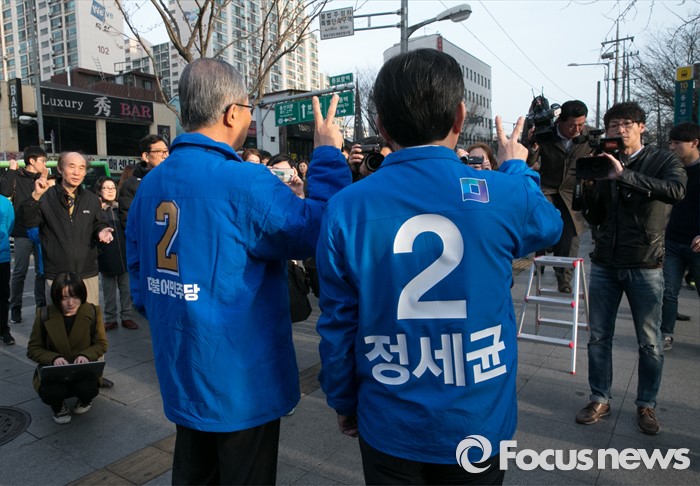 (서울=포커스뉴스) 20대 총선 공식선거 운동이 시작된 31일 오전 서울 동묘앞역 인근 거리에서 김종인(왼쪽) 더불어민주당 비대위 대표 겸 선대위원장과 정세균 서울 종로구 후보가 취재진을 향해 포즈를 취하고 있다.