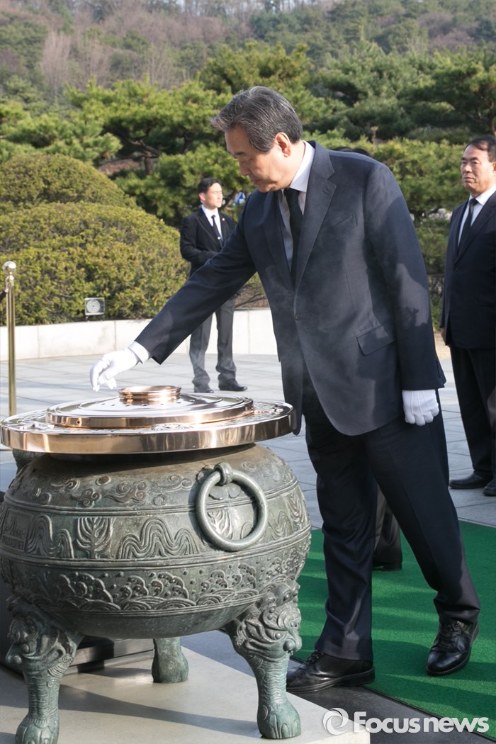 (서울=포커스뉴스) 4.13 총선 공식선거운동이 시작된 31일 오전 서울 동작구 국립현충원에서 김무성 새누리당 대표가 분향을 하고 있다.