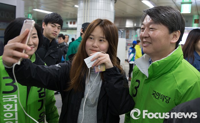 (서울=포커스뉴스) 총선 선거운동이 공식적으로 시작된 31일 오전 안철수 국민의당 상임공동대표가 서울 강북구 수유동에서 김기옥 강북갑 후보 지원 유세를 하던 중여학생과 셀카를 찍고 있다.