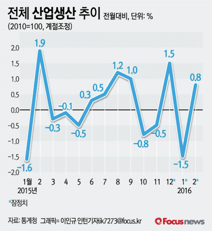 (서울=포커스뉴스) 통계청이 31일 발표한 '산업활동동향'을 보면 2월 전체 산업생산은 1월보다 0.8% 증가했다. 전년 같은 기간에 비해선 2.4% 늘었다.