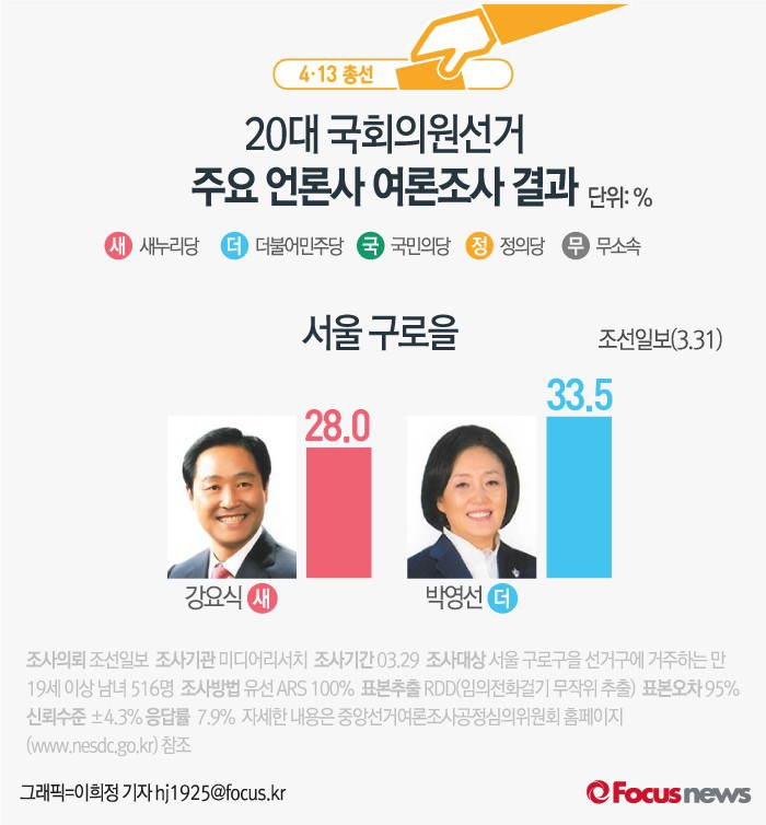 (서울=포커스뉴스) 조선일보가 미디어리서치에 의뢰해 31일 발표한 여론조사 결과에 따르면 새누리당 강요식후보의 지지율은 28.0%, 더불어민주당 박영선후보는 33.5%를 기록했다.