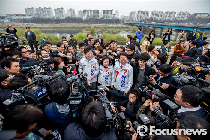 (대구=포커스뉴스) 무소속 대구 동구을 유승민(왼쪽) 후보, 무소속 대구 북구갑 권은희(가운데) 후보, 뭇속 대구 동구갑 류성걸 후보가 31일 오전 대구 동구 공항교에서 열린 공동 출정식에 참석해 취재진에게 질문을 받고 있다.