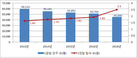 지방자치단체별로는 서울특별시 1475억원(31.1%)과 경기도 1045억원(20.2%), 경상남도 345억원(7.6%) 순으로 많다.공공도서관 1곳당 봉사대상 인구 수 및 1인당 장서 수 그래프(2016년은 추정치, 2018년은 목표치).<자료제공=문화체육관광부>