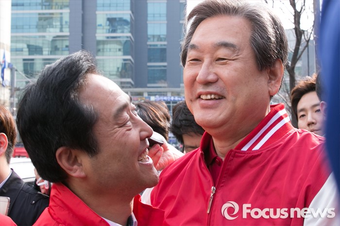(서울=포커스뉴스) 4.13 총선 공식선거운동이 시작된 31일 오전 서울 구로구 구로디지털단지역 인근 한 대형마트 앞에서 김무성(오른쪽) 새누리당 대표와 강요식 구로을 후보가 크게 웃고 있다.