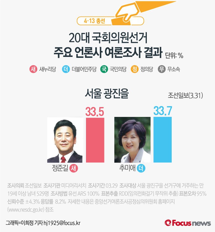 (서울=포커스뉴스) 조선일보가 미디어리서치에 의뢰해 31일 발표한 여론조사 결과에 따르면서울 광진을 등 대부분 지역에서 오차범위 내 초접전을 벌이고 있는 것으로 나타났다.