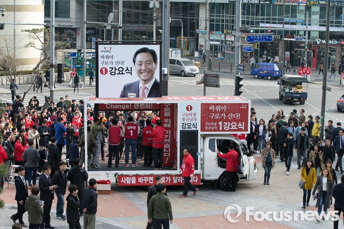 (서울=포커스뉴스) 4.13 총선 공식선거운동이 시작된 31일 오전 서울 구로구 구로디지털단지역 인근 한 대형마트 앞에서 김무성 새누리당 대표가 강요식 구로을 후보 지원유세를 하는 동안, 시민들이 지켜보고 있다.