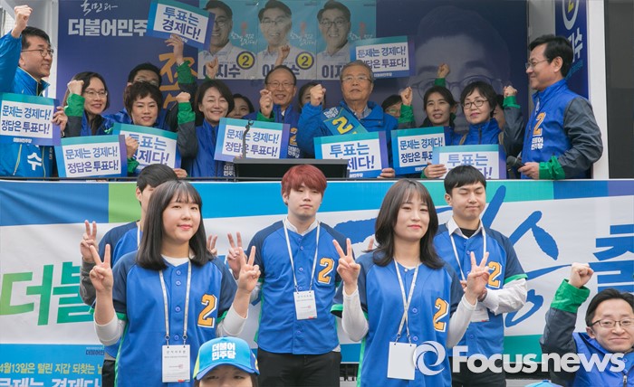 (서울=포커스뉴스) 20대 총선 공식선거 운동이 시작된 31일 오전 서울 남대문시장에서 열린 더불어민주당 중앙선거대책위원회 출정식에 참석한 김종인 비대위 대표 겸 선대위원장, 이지수 중구성동을 후보, 비례대표 후보들이 파이팅을 외치고 있다.
