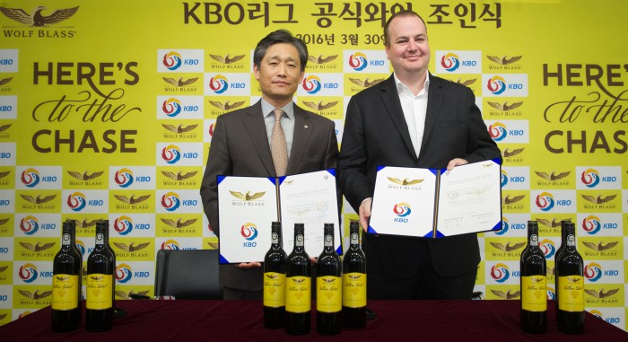 울프블라스는 전날 서울 강남 도곡동 야구회관 7층 브리핑룸에서 '2016 KBO 리그 공식 와인 후원' 계약을 체결했다. 이날 조인식에는 울프블라스 소유 기업인 트레저리 와인 에스테이트의 피터딕슨 북아시아 사장과 KBO 양해영 사무총장이 참석했다.