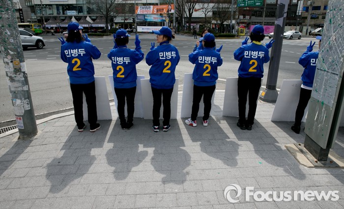 (서울=포커스뉴스) 20대 총선 공식선거 운동이 시작된 31일 오전 서울 장안동사거리에서 민병두 더불어민주당 동대문을 후보 선거운동원들이 지지를 호소하고 있다.