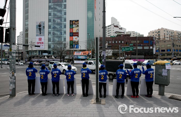 (서울=포커스뉴스) 20대 총선 공식선거 운동이 시작된 31일 오전 서울 장안동사거리에서 민병두 더불어민주당 동대문을 후보 선거운동원들이 지지를 호소하고 있다.