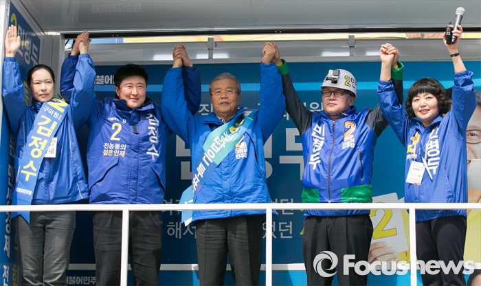 (서울=포커스뉴스) 20대 총선 공식선거 운동이 시작된 31일 오전 서울 장안동사거리에서 열린 민병두 더불어민주당 동대문을 후보 출정식에 참석한 김종인 비대위 대표 겸 선대위원장과 후보들이 손을 들어 포즈를 취하고 있다. 왼쪽부터 김정수 동대문마 구의원 후보 내외, 김 대표, 민 후보 내외.