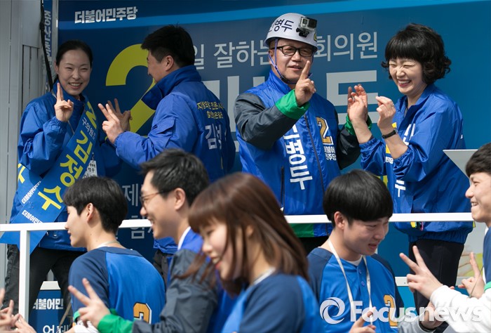 (서울=포커스뉴스) 20대 총선 공식선거 운동이 시작된 31일 오전 서울 장안동사거리에서 열린 민병두 더불어민주당 동대문을 후보 출정식에 참석한 민(오른쪽) 후보 내외와 김정수 동대문구마 구의원 후보 내외가 율동을 따라하고 있다.