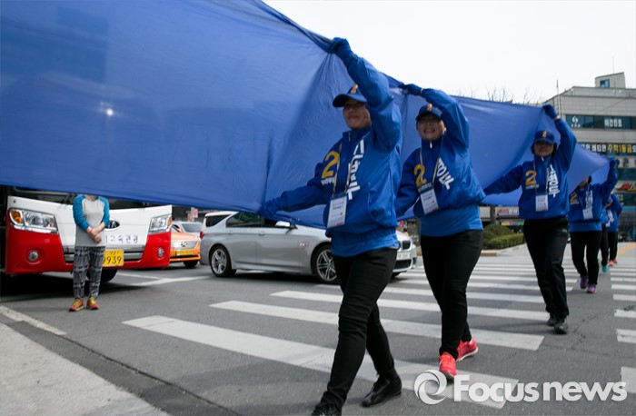 (서울=포커스뉴스) 20대 총선 공식선거 운동이 시작된 31일 오전 서울 장안동사거리에서 열린 민병두 더불어민주당 동대문을 후보 출정식에 참여한 선거운동원들이 퍼포먼스를 하고 있다.