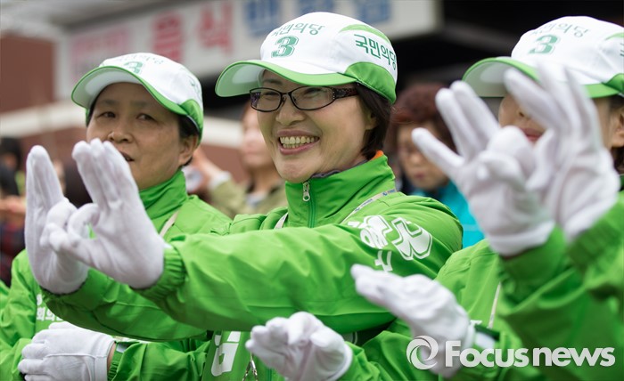 (서울=포커스뉴스) 총선 선거운동이 공식적으로 시작된 31일 오후 서울 영등포구 여의도백화점 앞에서 선거운동 자원봉사자들이 김종구 국민의당 영등포을 후보 지원 유세를 하고 있다.