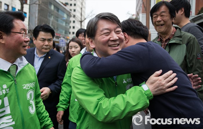 (서울=포커스뉴스) 총선 선거운동이 공식적으로 시작된 31일 오후 안철수 국민의당 상임공동대표가 서울 영등포구 여의도백화점 앞에서 김종구 영등포을 후보 지원 유세를 하던 중 한 지지자와 포옹하고 있다.